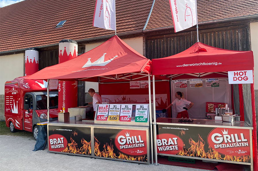 Die eingesetzten MASTERTENT-Grillpavillons zeichnen sich durch einen schnellen, unkomplizierten Auf- und Abbau aus und ermöglichen einen offenen Verkauf auf Augenhöhe mit den Gästen. Das durchdachte System in Kombination mit einem stimmigen und klar wiedererkennbaren Branding hat über viele Jahre hinweg zahlreiche Besucher bei legendären Partys, Geschäftseröffnungen, Polterabenden, Hausmessen und weiteren Events begeistert.